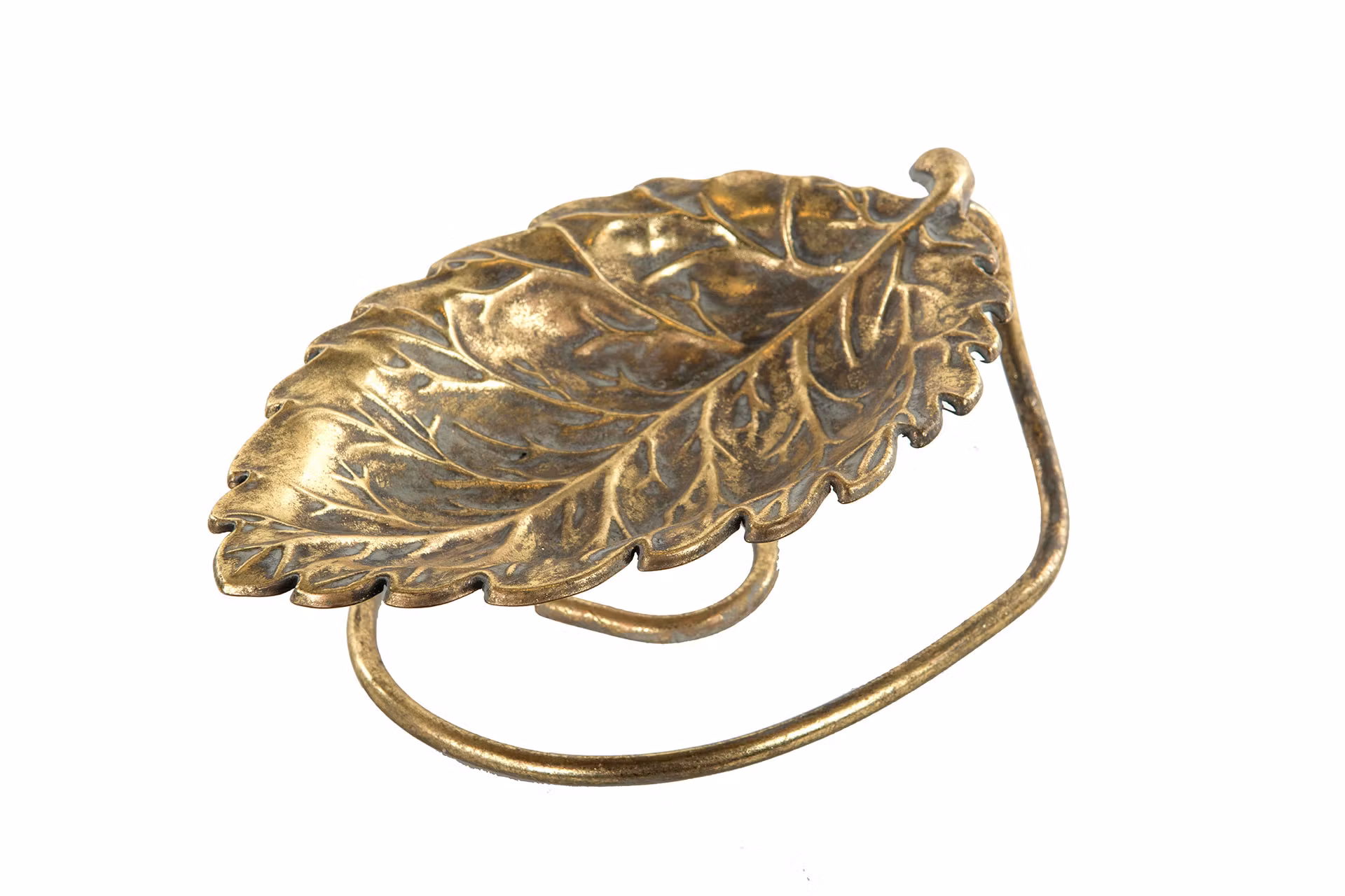 Förgyll ditt hem med detta eleganta fat på fot, designat i form av ett blad. Tillverkat i guld- och brun metall, ger det en stilren och naturlig känsla till din inredning.