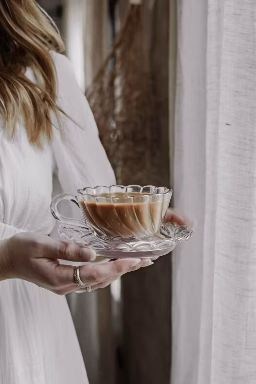 Elegant kopp med fat i klarglas – tidlös design med mjuka, böljande former